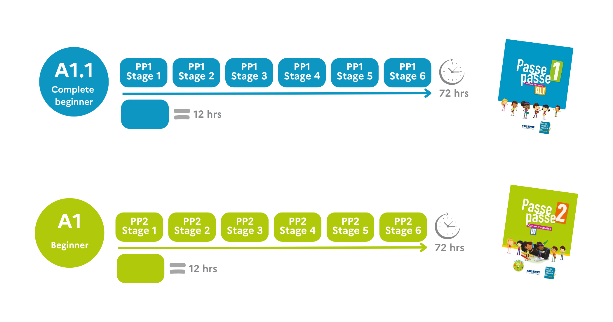 Once they've successfully completed Passe Passe 1, they'll move on to "Passe Passe 2" at the A1 level. Just like the first stage, Passe Passe 2 is also divided into 6 stages, each requiring around 72 hours to complete. Your child will continue to learn in a colorful and enjoyable environment, joining their favorite characters on new and exciting adventures.