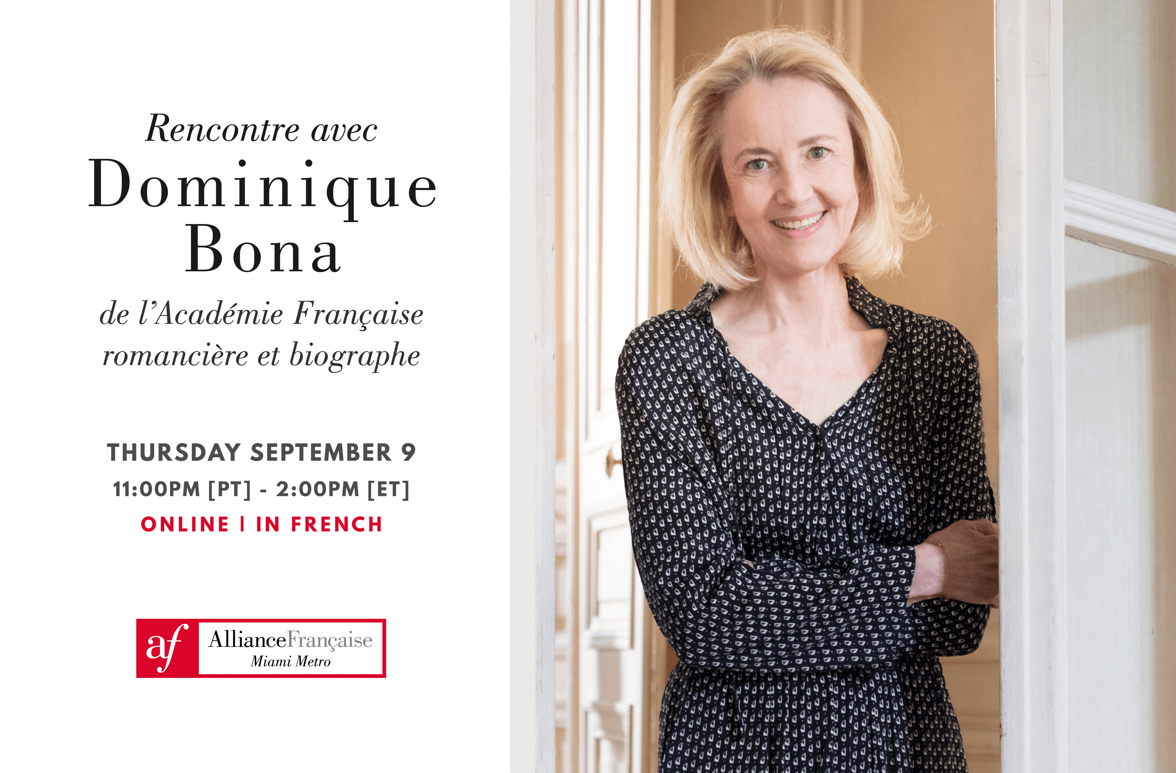 « Immortelle » depuis 2013, Dominique Bona est la huitième femme élue à l’Académie Française depuis sa création en 1635. Journaliste, critique littéraire, romancière et biographe, Dominique vient à la rencontre de l’Alliance Française de Miami Metro pour nous parler de ses passions : La langue française, l’Académie, les femmes et hommes dont elle a écrit la biographie, et l’inspiration des personnages de ses romans.